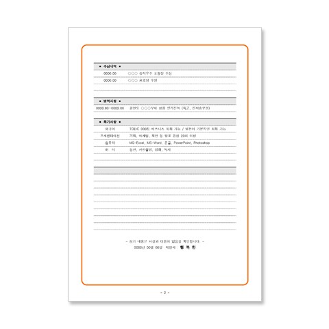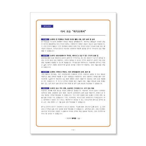 기존 문방구 이력서에서 탈피해 깔끔하면서 차별되고, 단정한 이력서를 원하시는 분들께 추천합니다. 복잡한 기능을 사용하지 않았기에 초보수준이더라도 재 편집이 가능합니다. 자기소개서 작성시 내용 작성에 대한 의견을 넣어 두었습니다.