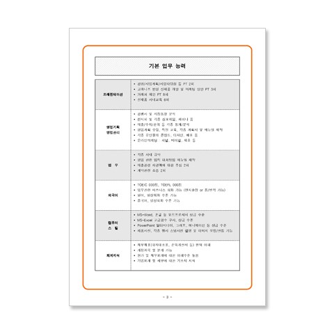 Page1 : 이력서(앞) Page2 : 이력서(뒤) Page3 : 기본 업무 능력 - 본인의 기본적 스킬들을 작성 Page4 : 주요 경력 요약 - 전 직장에서의 주요 경력을 표현할 수 있는 주요 경력 요약 Page5 : 자기소개서 - 본인만의 스토리를 작성할 수 있는 자기소개서 양식