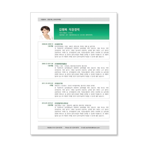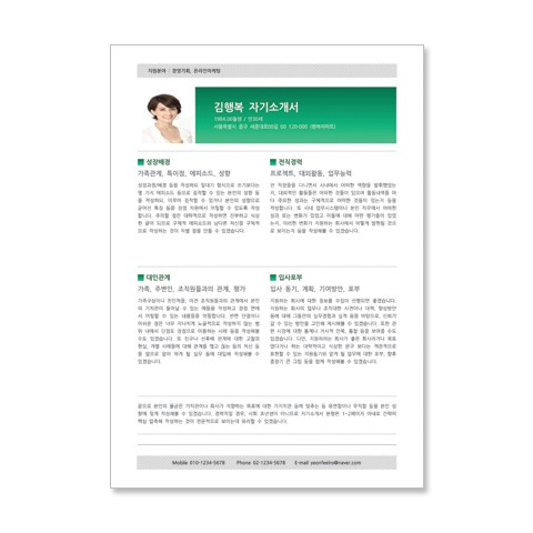 기존 문방구 이력서에서 탈피해 깔끔하면서 차별되고, 단정한 이력서를 원하시는 분들께 추천합니다. 복잡한 기능을 사용하지 않아 초보수준이더라도 재 편집이 가능합니다. 자기소개서 작성시 내용 작성에 대한 의견을 넣어 두었습니다.