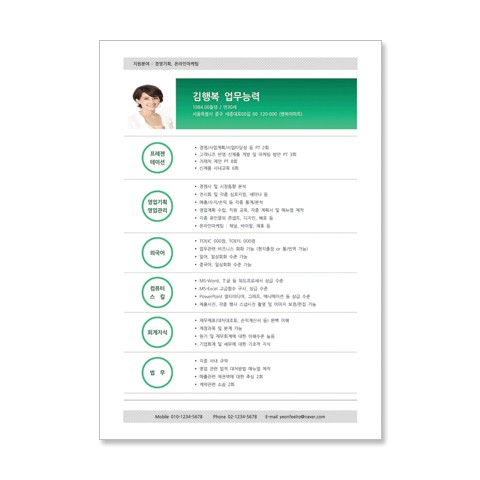 Page1 : 이력서 Page2 : 자기소개서 Page3 : 직장경력 - 전 직장경력을 상세히 간략히 또는 상세히 작성하실 수 있도록 했습니다. Page4 : 업무능력 - 분야별 본인의 업무경험이나 능력을 간략히 나열하실 수 있도록 했습니다.