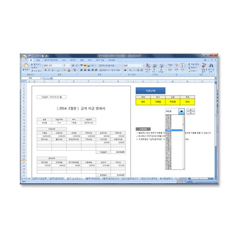 “급여 지급 명세서” 시트에서는 임직원 명을 펼침메뉴 버튼회전자 버튼을 이용해 편리하게 찾을 수 있습니다.
