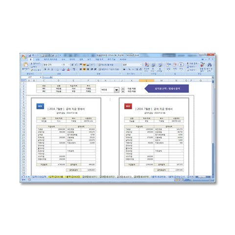 ※ 구입하시면, 급여명세서(F1) 시트는 노출되어 있고, 나머지 디자인 3종(F2~F4)은 숨겨져 있습니다. [숨기기 취소]하시면 됩니다.